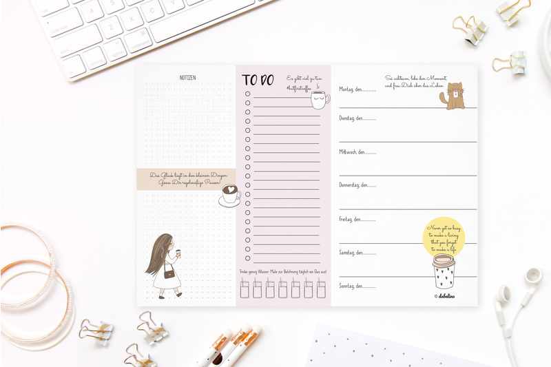 Dieser Wochenplaner mit süßen Illustrationen und Sprüchen zum Thema Achtsamkeit ist die perfekte Organisations- und Motivationshilfe für die Woche. Er kombiniert einen Kalender ohne Datum mit einer To-Do-Liste und erinnert ganz nach dem Motto "Live mindfully" z. B. daran regelmäßig zu trinken und Pausen zu machen.