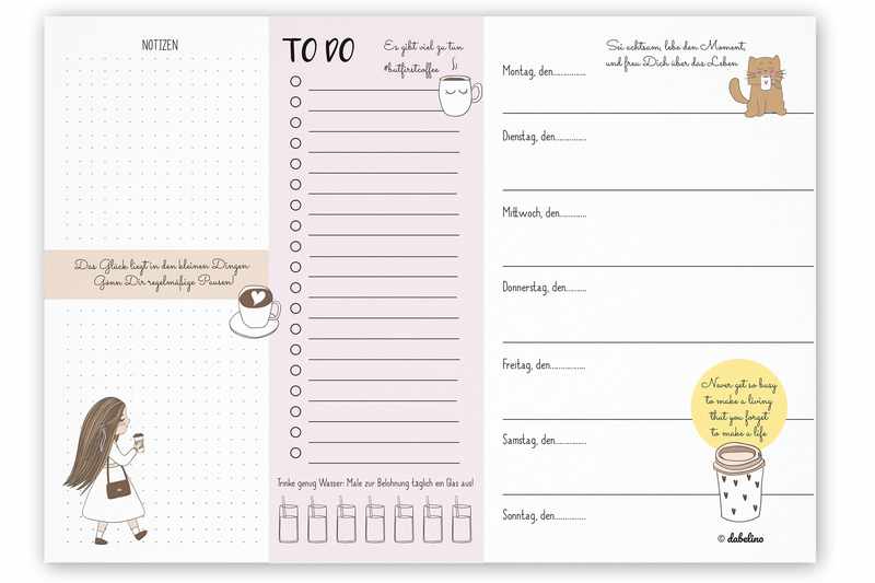 Hier ist Platz für alle To Do's, Termine, Wochenziele und für kleine Notizen wie z. B. die Einkaufsliste oder Telefon-Notizen. Das gleichzeitige Zettel-Wirrwarr von unterschiedlichen Listen entfällt damit. Endlich nur eine Liste für alles!